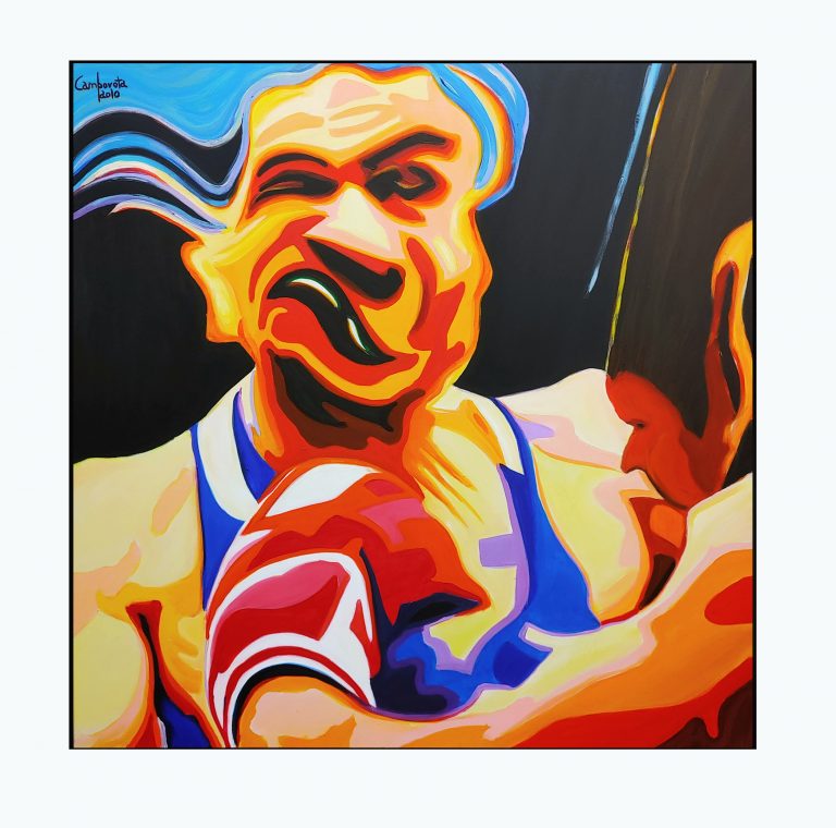 Nella foto il critico Vittorio Sgarbi osserva  l’opera di Paolo Camporota  “donna allo specchio”.
